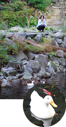 池には、天成園さんのマスコット「あひるのがーちゃん」が住んでいます!ごあいさつしておきました。