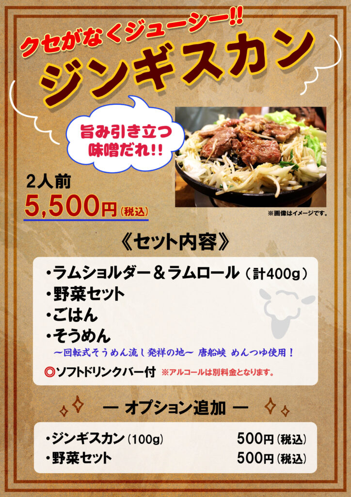 庭園茶屋・たまだれ庵の新メニュー!≪ジンギスカン≫ テーブルを囲んで、ジューシーなお肉と野菜・ごはん・そうめんをお楽しみください! ソフトドリンクバーも付いています☆