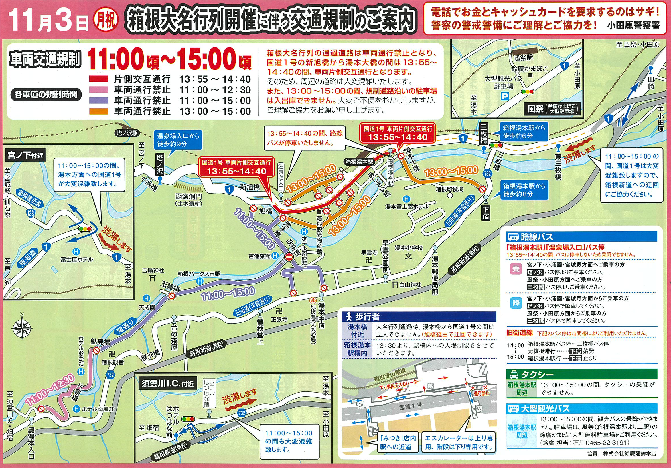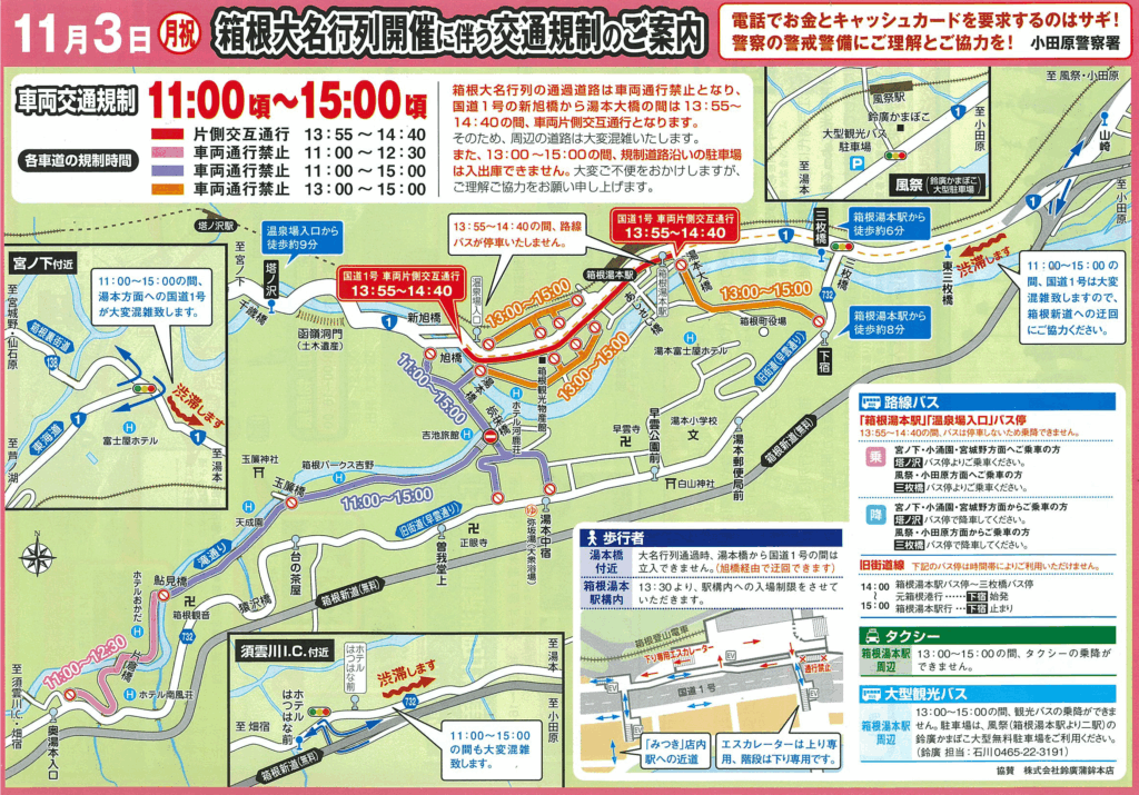 当日は箱根湯本駅周辺の交通規制が行われ、周辺の道路は大変混雑します。