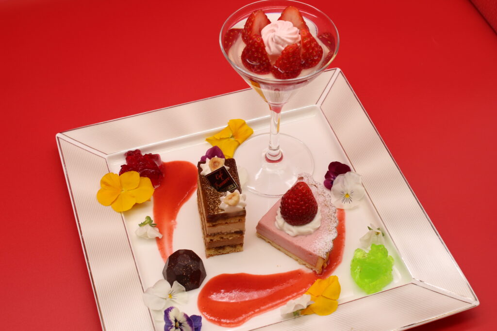 パンナコッタのやさしい甘さと苺の酸味が調和したグラスデザート、チョコレートケーキ、苺ムースタルトを一皿に。宝石を思わせるチョコやフルーツジュレのきらめきが、春ならではの華やかさを演出しています。
