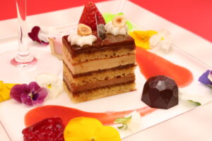 パンナコッタのやさしい甘さと苺の酸味が調和したグラスデザート、チョコレートケーキ、苺ムースタルトを一皿に。宝石を思わせるチョコやフルーツジュレのきらめきが、春ならではの華やかさを演出しています。
